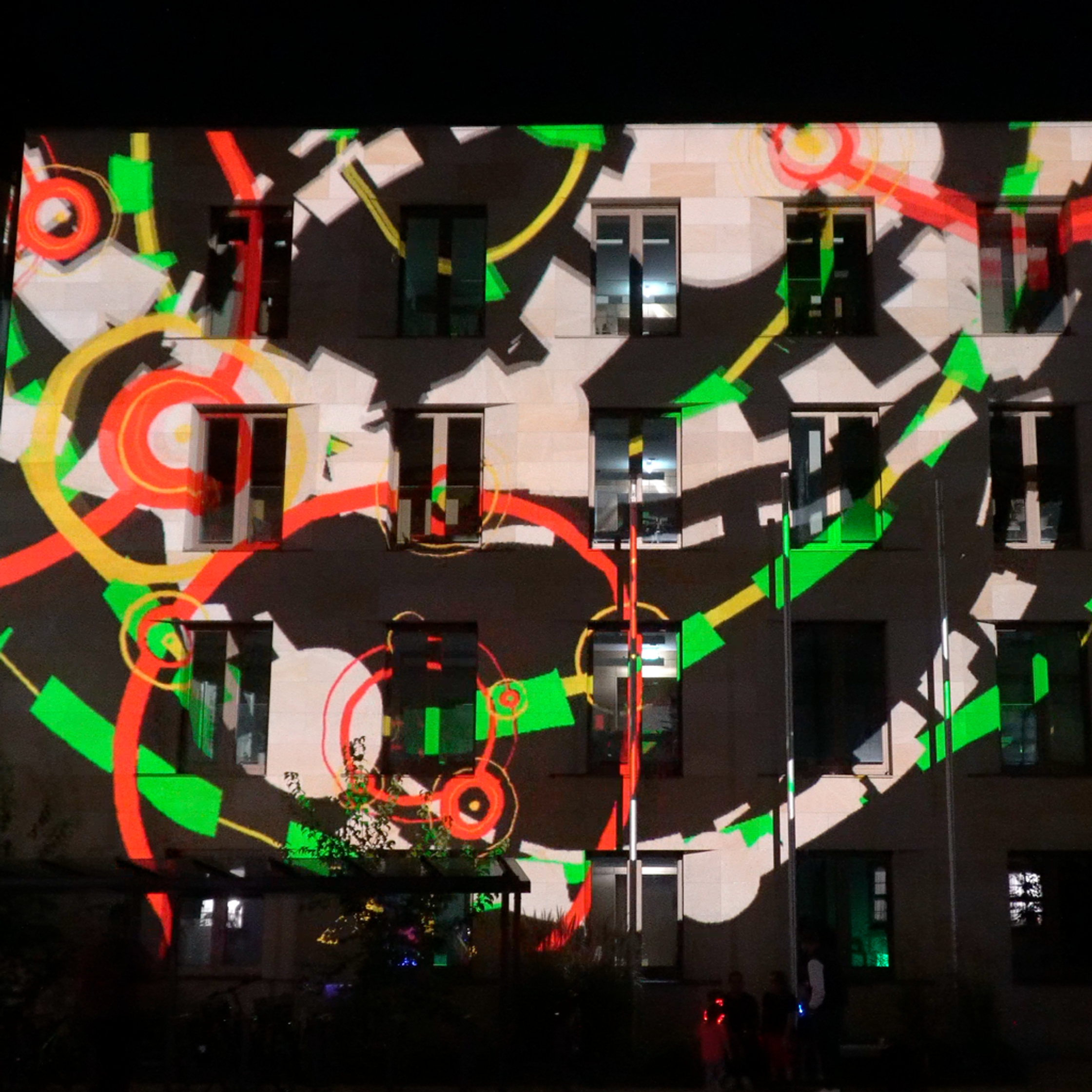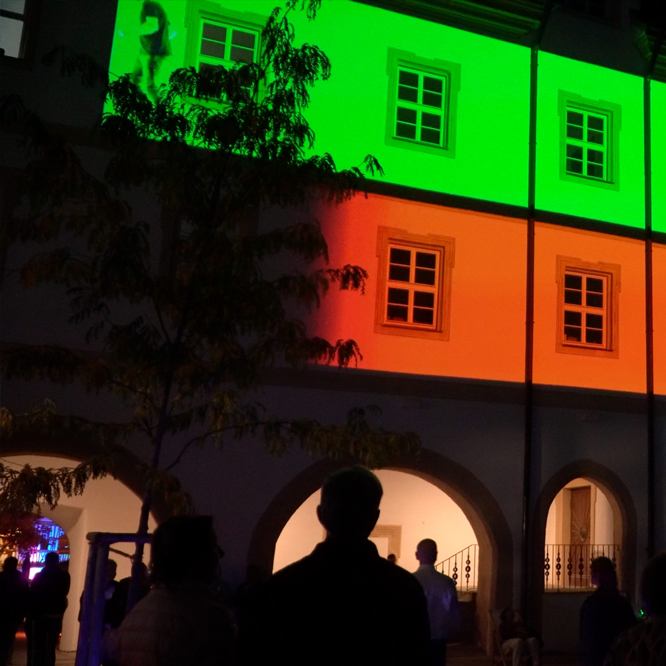 Der VEB Lichtbildklub lässt sich auf einen Dialog mit den Fassaden des neu gestalteten Rathaushofs in Herzogenaurach ein. Schloß trifft auf Neubau! Dem diesjährigen Veranstaltungsmotto „Kontrast“ folgend, werden die Unterschiede der Baukörper mittels Projektion aufgezeigt, gegen den Strich gebürstet, zerlegt und wieder neu zusammen gesetzt. Mit unterschiedlichsten grafischen Mitteln entsteht ein Jahrmarkt aus Licht und Bewegung. Die „elektrischen Wunderlampen“ zaubern Überraschendes an die Wände und die Bilder verbinden sich mit der Musik.
